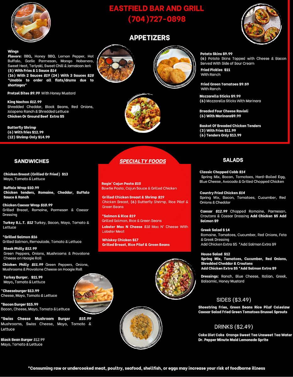 Eastfield Bar & Grill, nestled in the heart of Charlotte at 8709 Arbor Creek Dr, offers a welcoming spot where friends and families gather to enjoy hearty meals and vibrant company. This neighborhood gem stands out with its diverse menu, featuring crowd-pleasers like crispy fried pickles, savory fried green tomatoes, and customizable burgers that invite you to craft your perfect bite. The food strikes a balance between comforting and flavorful, with dishes like salmon that satisfy without fuss, complemented by attentive service that makes every visit feel special.